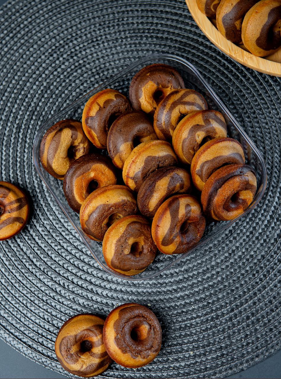 سپس، ترکیب آرد کامل و هل به مواد اضافه میشود تا خمیری لطیف و خوشعطر به دست بیاید. این دوناتها در فر پخته میشوند، نه در روغن، تا بافتی سبک و سالم داشته باشند.