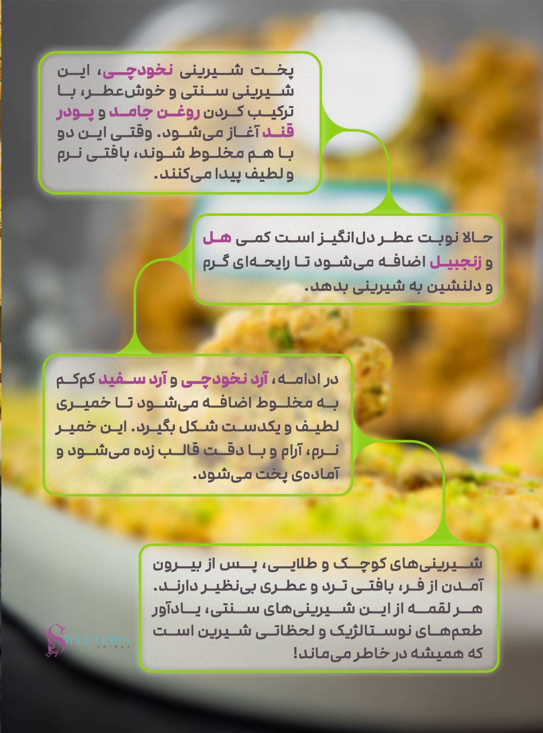 شیرینیهای کوچک و طلایی، پس از بیرون آمدن از فر، بافتی ترد و عطری بینظیر دارند. هر لقمه از این شیرینیهای سنتی، یادآور طعمهای نوستالژیک و لحظاتی شیرین است که همیشه در خاطر میماند!